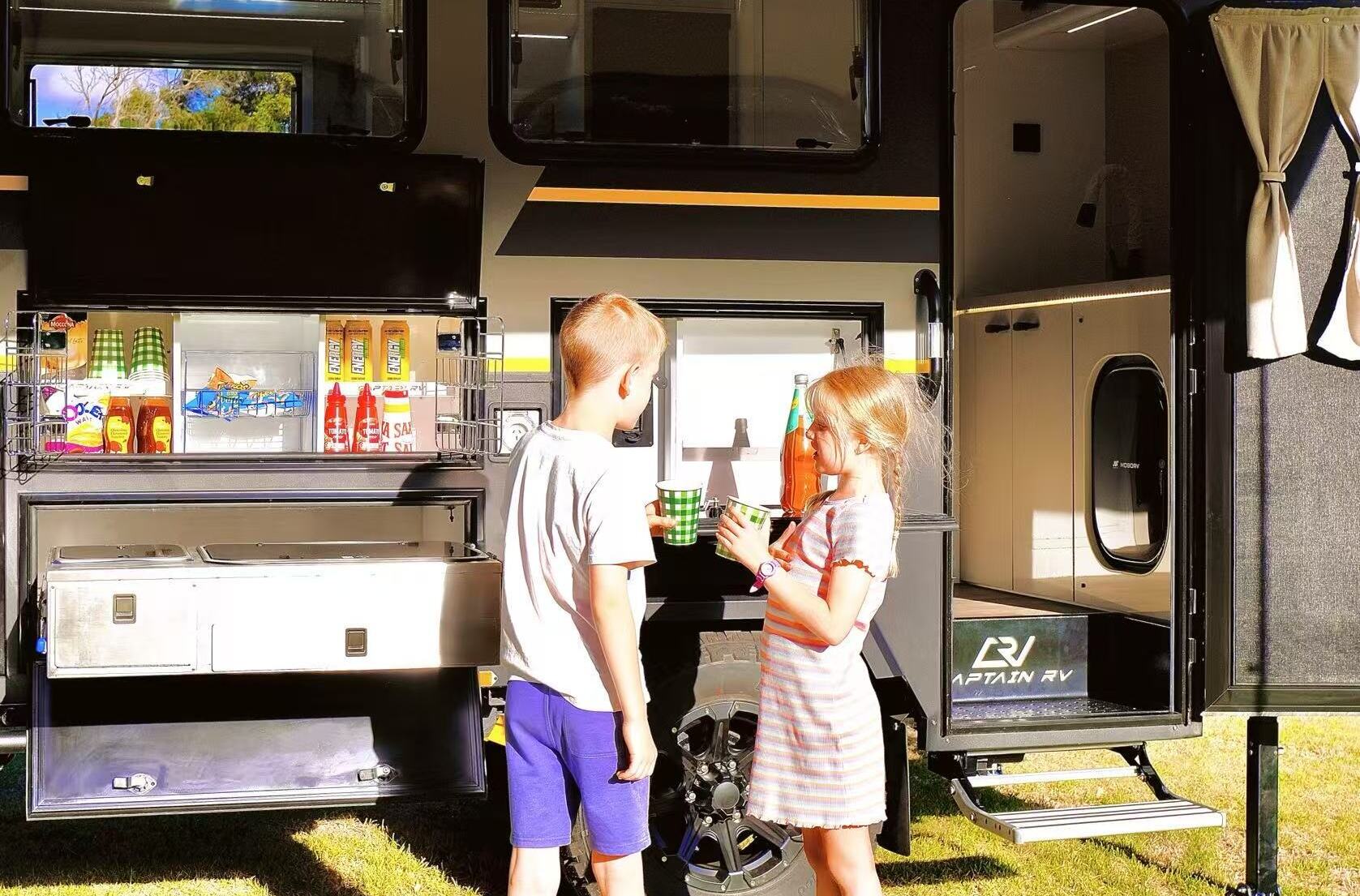 - Outdoor Living: includes an electric awning, pull-out kitchen, 120L slide-out fridge, and external speakers.
