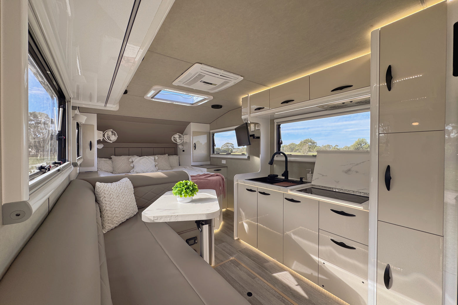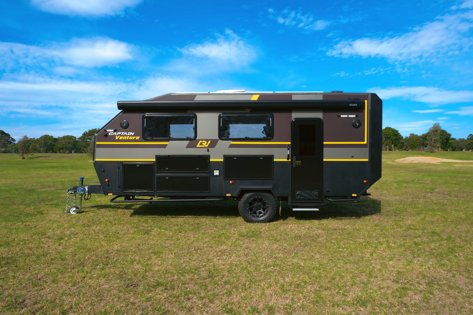 Experience the MY25 Captain Venture, a 17-foot caravan with a space maximizing design offering 19 feet of interior space.
