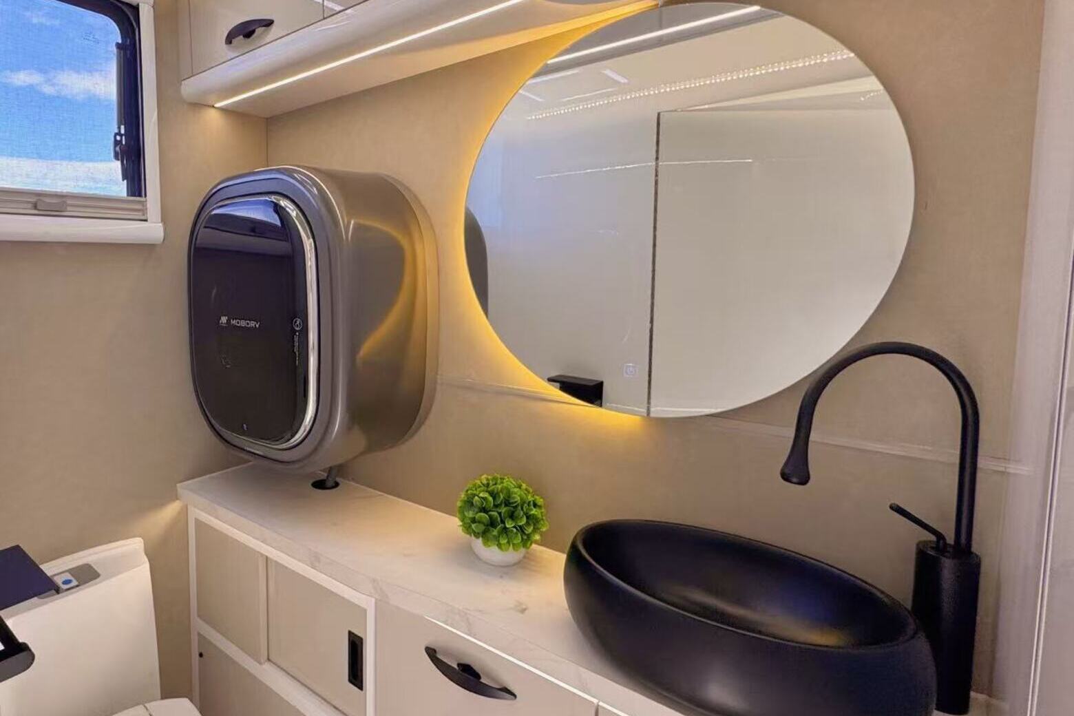 - Features include a dual kitchen, premium appliances (coffee machine, washer, fridge), and a Domestic dual-mode AC powered by lithium batteries.