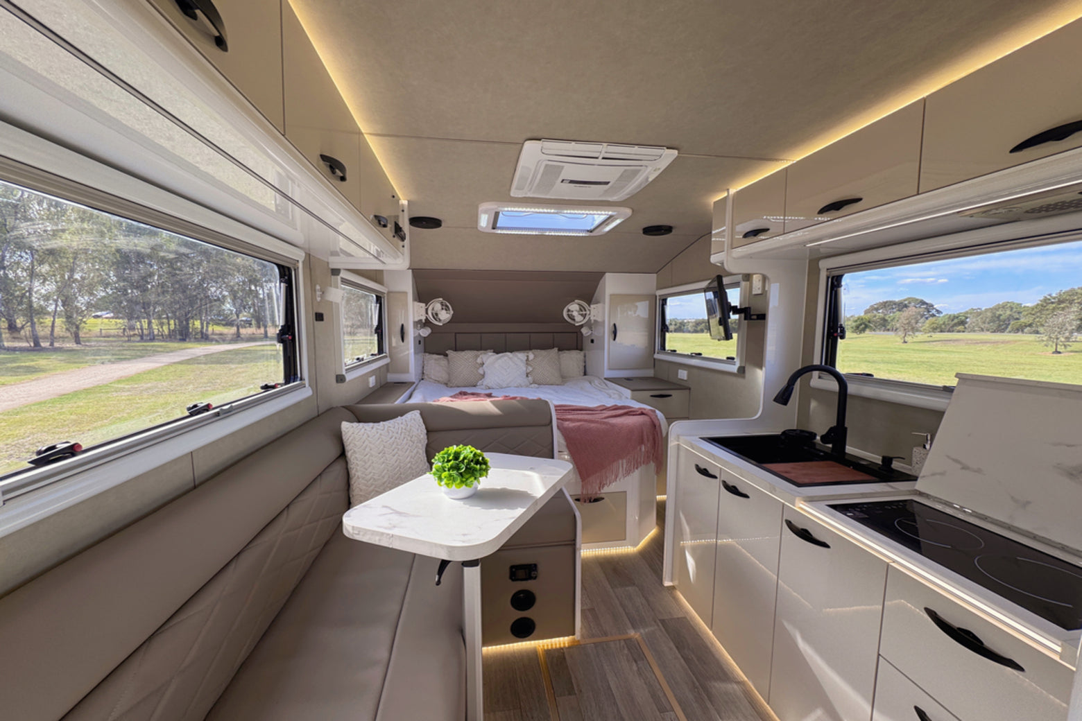 - Equipped with a 600W solar + 300Ah lithium battery system, 3000W inverter, and Redarc charging tech for reliable off-grid power. Includes ample storage, a 17-inch control hub, and adaptable living spaces, blending off-grid capability with residential comfort.